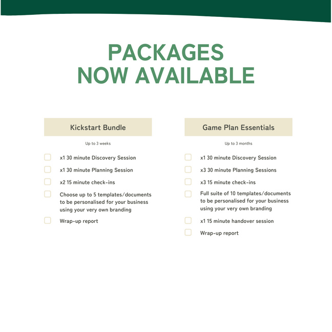 Empower your business journey with Project Kai's tailored packages: the Kickstart Bundle for a focused business boost, or the Game Plan Essentials for a comprehensive collateral transformation. Both options offer planning sessions, customised templates, and expert support to elevate your business with efficiency and style so that you can focus on the big picture.